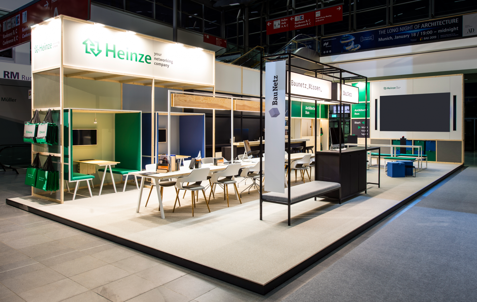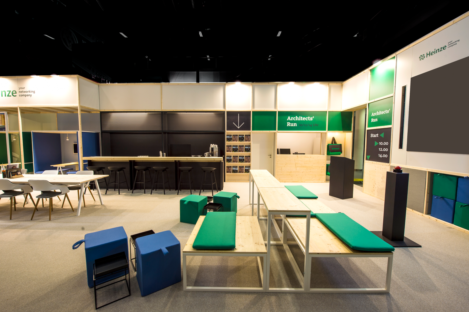 Concept, design and production of a sustainable fair stand for HEINZE, the leading information platform for architectural objects, construction products and company profiles. Most of the stand consists of furnitures and elements we designed to be reused in follow up events and upcoming fairs. They can be easily set up and then disassambled to a perfect shipping size.