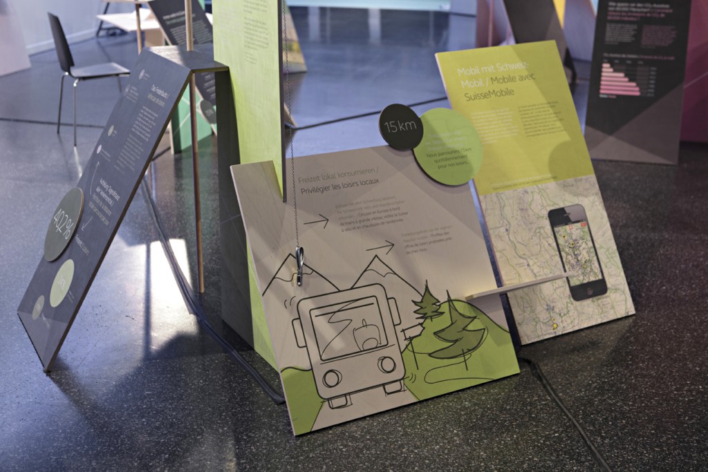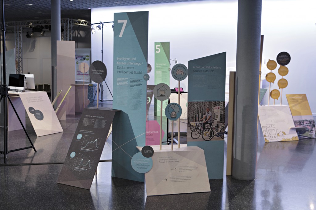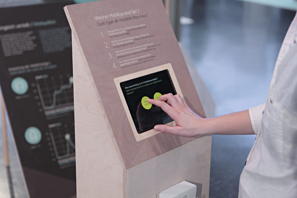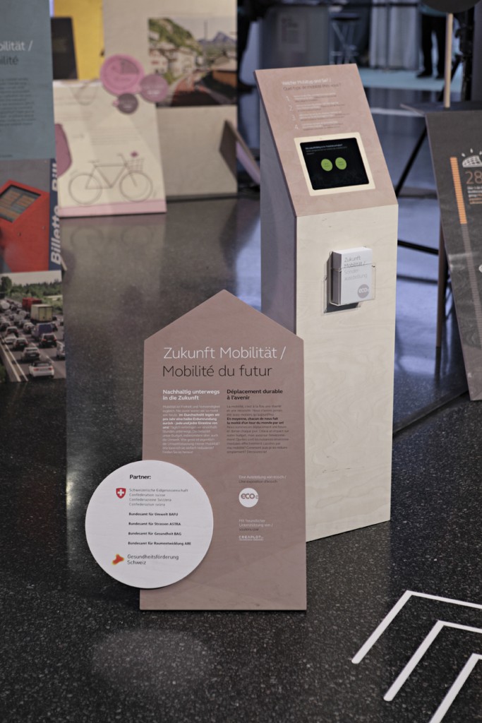 Interactive exhibition stand at the Eco fair in Basel. Visitors could experience and scrutinize their own behavioral patterns on mobility – and at the same time, learn about related topics such as current traffic problems, future transportation and residential concepts in Switzerland.